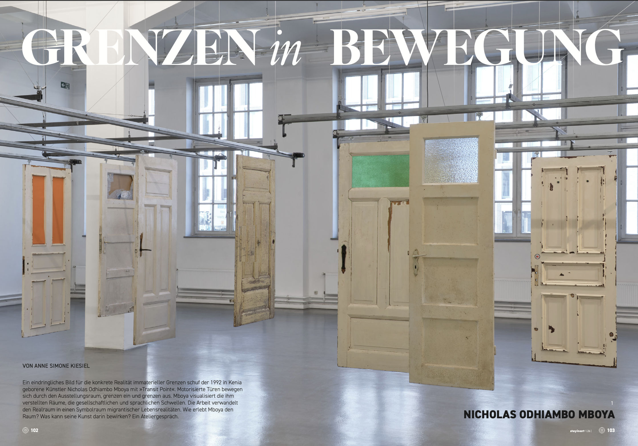 Motorised doors move through the showroom, border in and out. Mboya visualizes the space he has appointed, the social and linguistic upheaval.The work transforms the real space into a symbolic space of migrant realities. How does Mboya experience the room? What can art so in this? Astudio conversation.