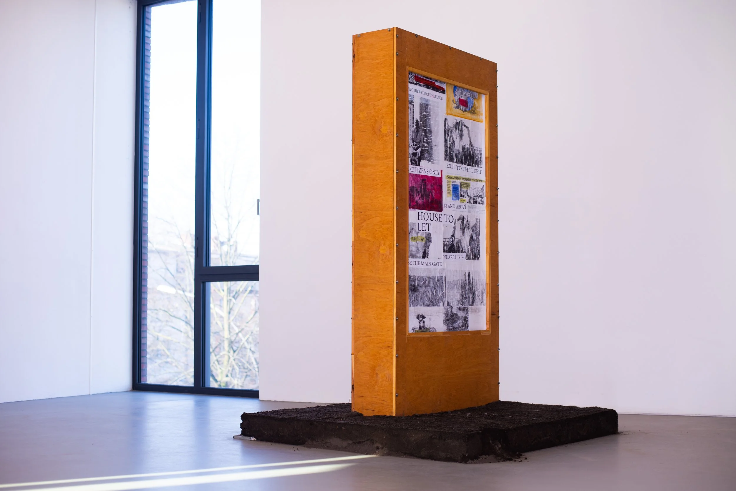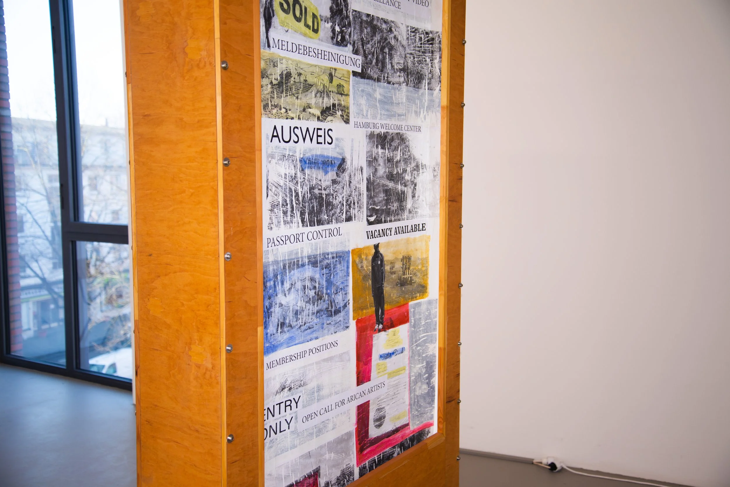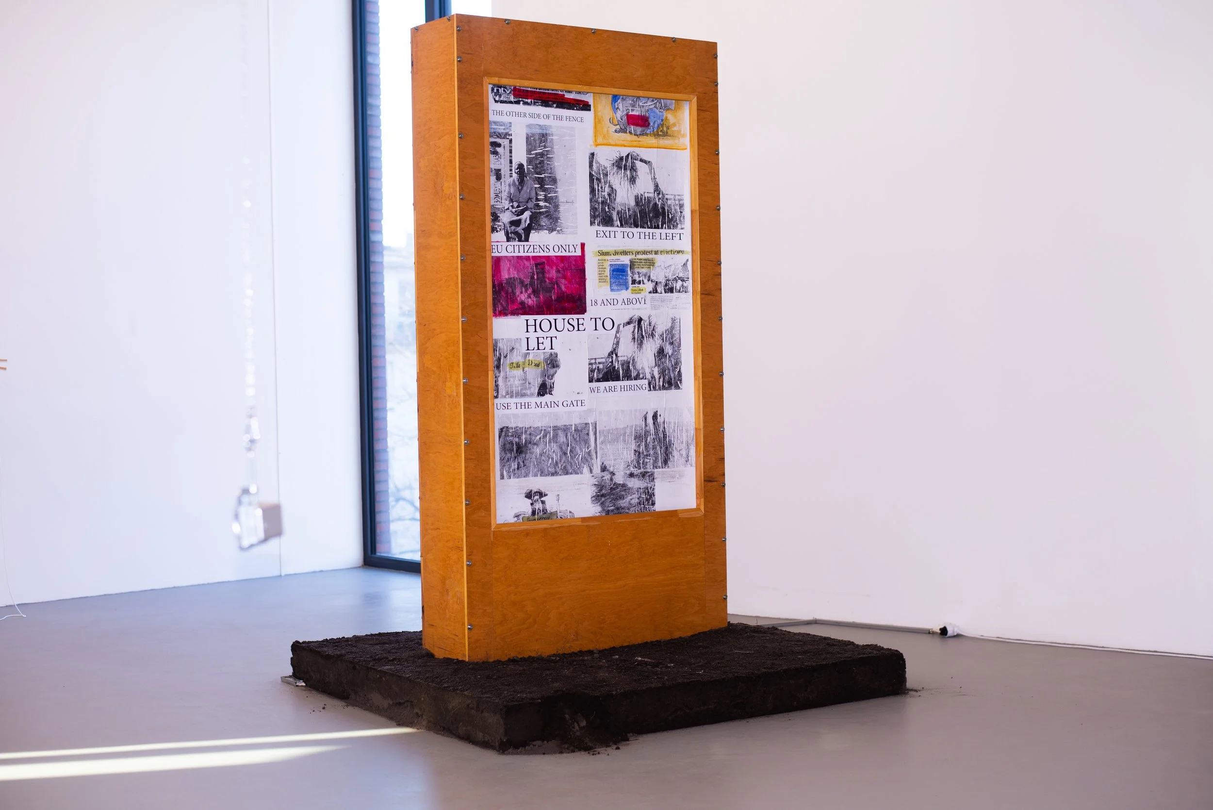 The work looks back to my homeland Kenya. A rotating poster advertising apparatus stands on a square of earth, through which no advertisements run, but rather collages of newspaper articles, press photos, and headlines. “Electric Fence”, “Cash Only”, “No Exit”, “Land not for Sale”, “Authorized Personnel Only” or “Be Ware Of Dogs”. These headlines and slogans give rise to fears, conjectures, and speculations about the problems in a place that, from the European point of view, lies far away. The distance becomes even clearer when the viewer realizes that the poster webs run through the machine so quickly that it is impossible to read or recognize image details. Perhaps a reference to the fact that the viewer cannot grasp the full dimensions from my privileged position, or an allusion to digital consumption of information, which often means that headlines are quickly scanned and images in small mobile phone formats are scanned in a matter of seconds? The newspaper articles deal with grievances that can be traced back to colonialism and still lead to problematic relationships between landowners, land sellers, and their borders with the rest of the population. Birthrights and patriarchal mechanisms come into play. The installation scheme expo lays traces of these complex, historical, and current grievances, it reveals research work and documentation but embeds them in a western classic consumer model. On the bare ground, the poster box appears alone and is left to its own devices. Perhaps she is waiting to be finally stopped, an indirect request for closer examination.